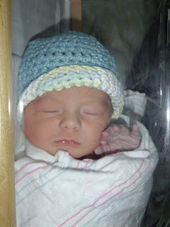 It's hard to believe that two whole weeks have passed already. I find myself cherishing these days...yes, even the middle of the night feedings...because I know this is our last one. And what a precious boy he is! Although, he has already put us to the test quite a bit. After a late night trip to the ER and several days of constant fussiness, he was diagnosed with a mild case of acid reflux. So, we hesitantly put him on the medication recommended and watched as he became a different baby almost overnight. He is now much happier and growing like a weed. At his 2 week appt, he had regained his birth weight (7 lbs. 14 oz.) and then some...weighing in at 9lbs! We call him "Stretch" because he is so tall and has the longest arms you've ever seen (maybe a future basketball player like his uncle?).